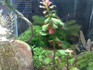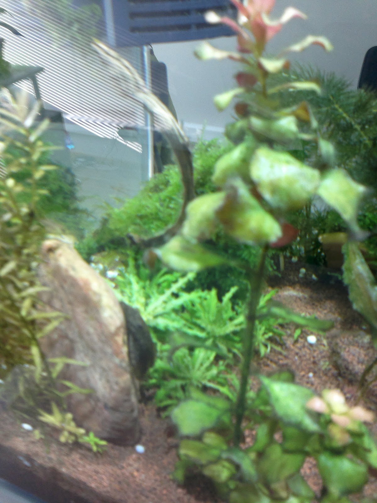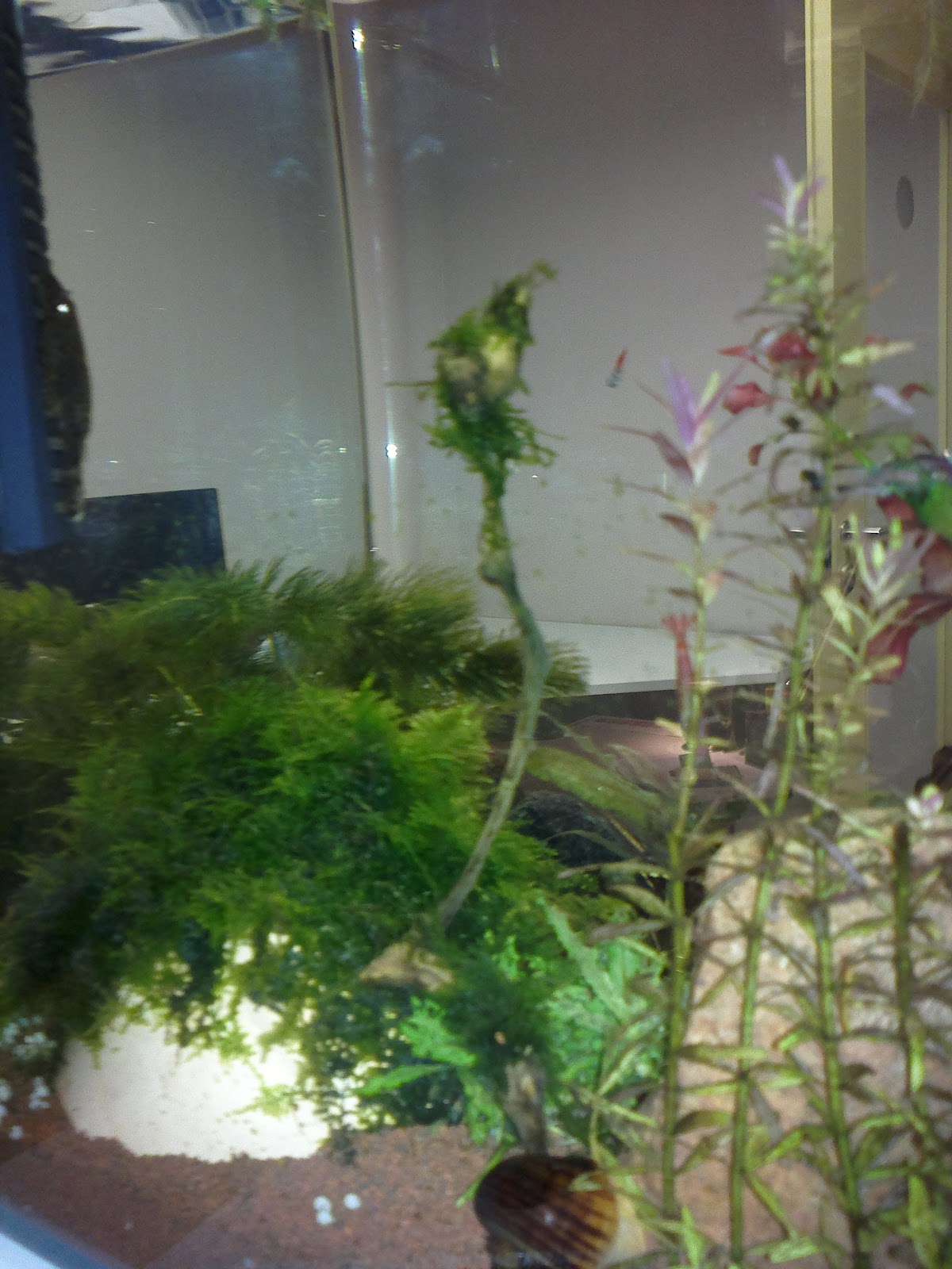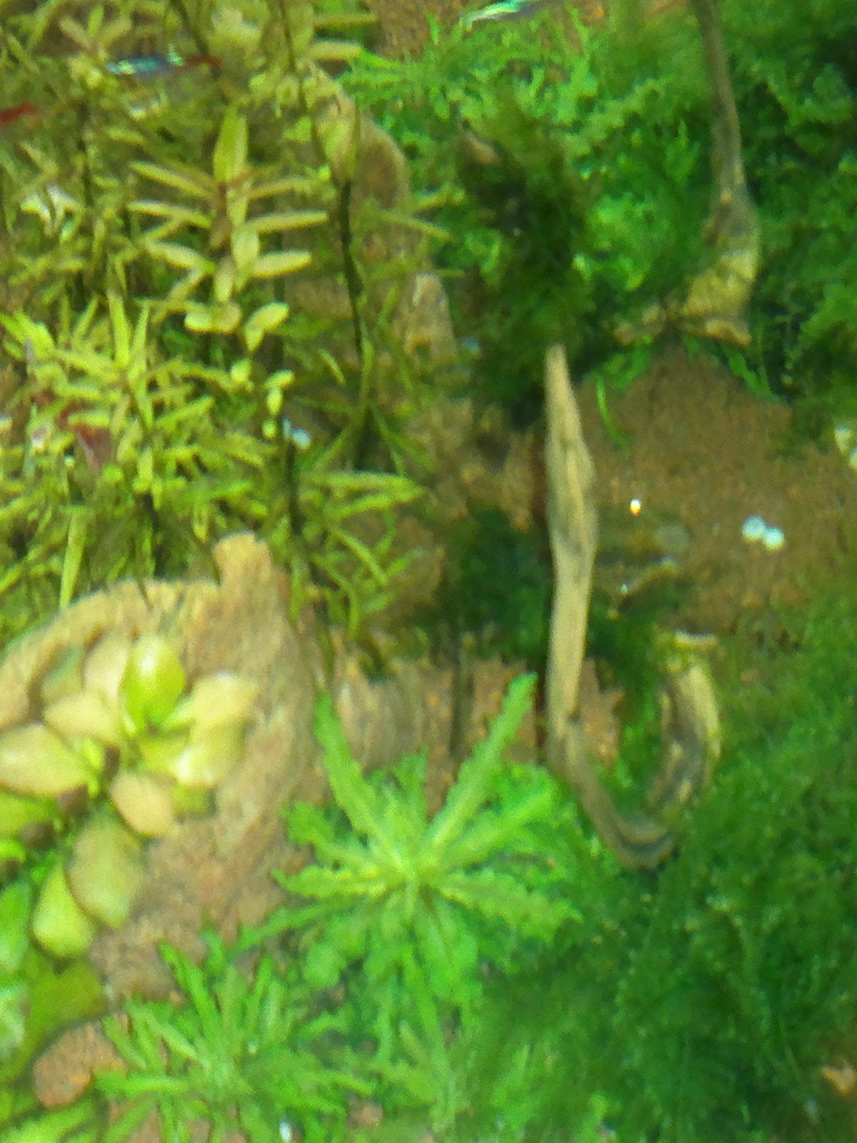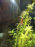 Täna avastasin ühe pisikese krevetipojukese rotala lehtede vahel turnimas. Paar päeva tagasi oli "hauduja" kesta vahetanud ja enam ei paistnud miskit hauduvat. Askeldab usinalt mööda taimi ringi ja täna teda jälgides märkasin ühe lehekese peal miskit liigutamas. Tähelepanelikumal uurimisel olid sel miskil küljes kaks musta täppi ja pisiksed vurrud! Rohkem pudinaid silma ei hakanud kuid ehk on neid veel kuskil peidus.