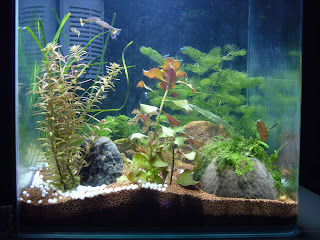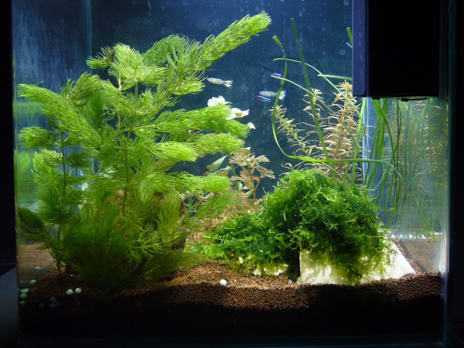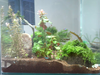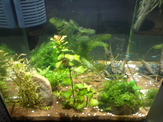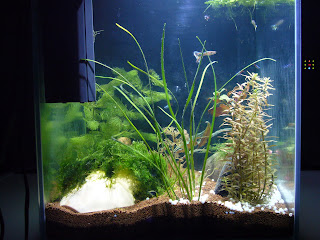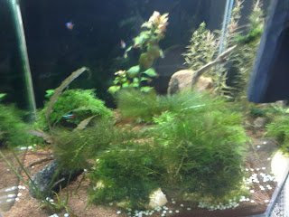 Üldjoontes võib öelda: elanikud tunnevad endid hästi, neoonid on silmnähtavalt suuremad kui sissekolides. Taimedel niihästi ei lähe, vesi on püsinud silmaga vaadates ja olemasolevate testide järgi normi piires ja tundub, et ka vetikas väga ei tapa, kuid siiski... Vallisneria ei taha hästi edeneda, pinnataimed ei kipu eriti vohama ja nende kenasti hõljuvad juured paistavad kuidagi kärbuvat. Enamus taimedest ei ole kirjade järgi hirmus kiired kasvajad väljaarvatud mõned erandid. Paari nädala eest sain haljastusele pisut lisa: