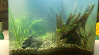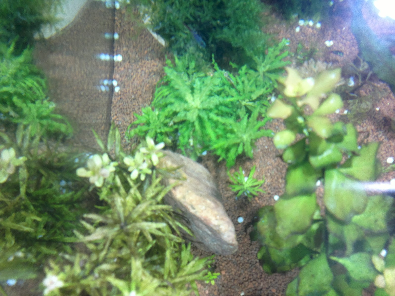 Istutada oli päris keeruline, näpitsad tuleb hankida, et saaks need tupsud kenasti kõigi juurtega piisavalt sügavale pinnasesse sokutatud. Paremal all nurgas paistab ka vetikatest väheke vaevatud (vanematel lehtedel) ludwigia. Vasakul all nurgas paistab rotala, mida vahepeal pisut pügasin enne kui uus agar tigu seltsis teiste asukatega. Sel kasvandikul õnnestus hoolimata vetikast ilmutada hämmastavalt kiiret juurdekasu akva esimese kuu jooksul. Neil muidu on ilusad uued lehed kasvanud mis omavad ka värvi kuigi on natuke nagu nirumad kui vanad lehed. Tigu armastab eriti turnida rotala otsas ja paistab, et mitte asjata, lehed tükk maad vabamad vetikast, cryptocoryne undulata on ka ilusti puhtamaks saanud kuid miskipärast ei leia mu "vetikamatsutajad" teed ludwigia lehtedele. Nudisin ära vallisneria nana kuna tal kippusid vanad lehed lisaks vetikale ka pehmeks minema ja aegajalt ilmus mõne pehmeneva varre ümber pinnase lähedal kahtlana valkjas natuke hallitust meenutav "udu" mispeale ma konkreetse lehe muidugi otsekohe eemaldasin. Nüüd ootan ja vaatan kas pinnases näha olnud risoomidest-pungadest uued võsukesed endid ka ilmutavad. Allolevatelt piltidelt ei paistagi, need jupikesed jäävad tumedama kivi taha nurka peitu.